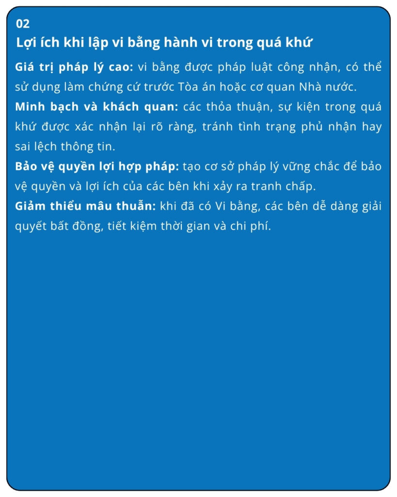 Trong thực tế đời sống và giao dịch dân sự, có nhiều sự kiện, hành vi đã diễn ra nhưng chưa được chứng minh bằng chứng từ rõ ràng. Khi phát sinh nhu cầu làm rõ hoặc xác nhận lại để tránh tranh chấp, Vi bằng hành vi trong quá khứ chính là công cụ pháp lý hiệu quả.