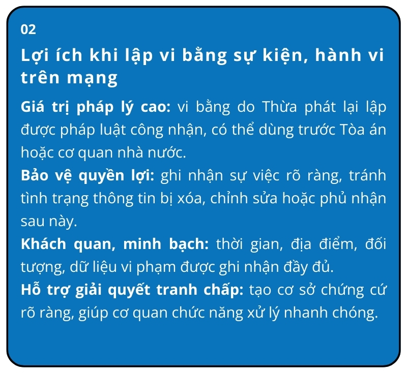 Trong thời đại số, Internet và truyền thông trực tuyến vừa mang lại lợi ích, vừa tiềm ẩn nhiều rủi ro pháp lý. Không ít cá nhân, doanh nghiệp bị ảnh hưởng nặng nề bởi các hành vi vi phạm trên mạng như tung tin giả, vu khống, xâm phạm bản quyền hay quảng cáo sai sự thật. Dịch vụ lập vi bằng sự kiện, hành vi trên mạng do Thừa phát lại Mekong thực hiện giúp khách hàng ghi nhận chính xác, khách quan các hành vi này để làm chứng cứ pháp lý khi bảo vệ quyền lợi của mình.